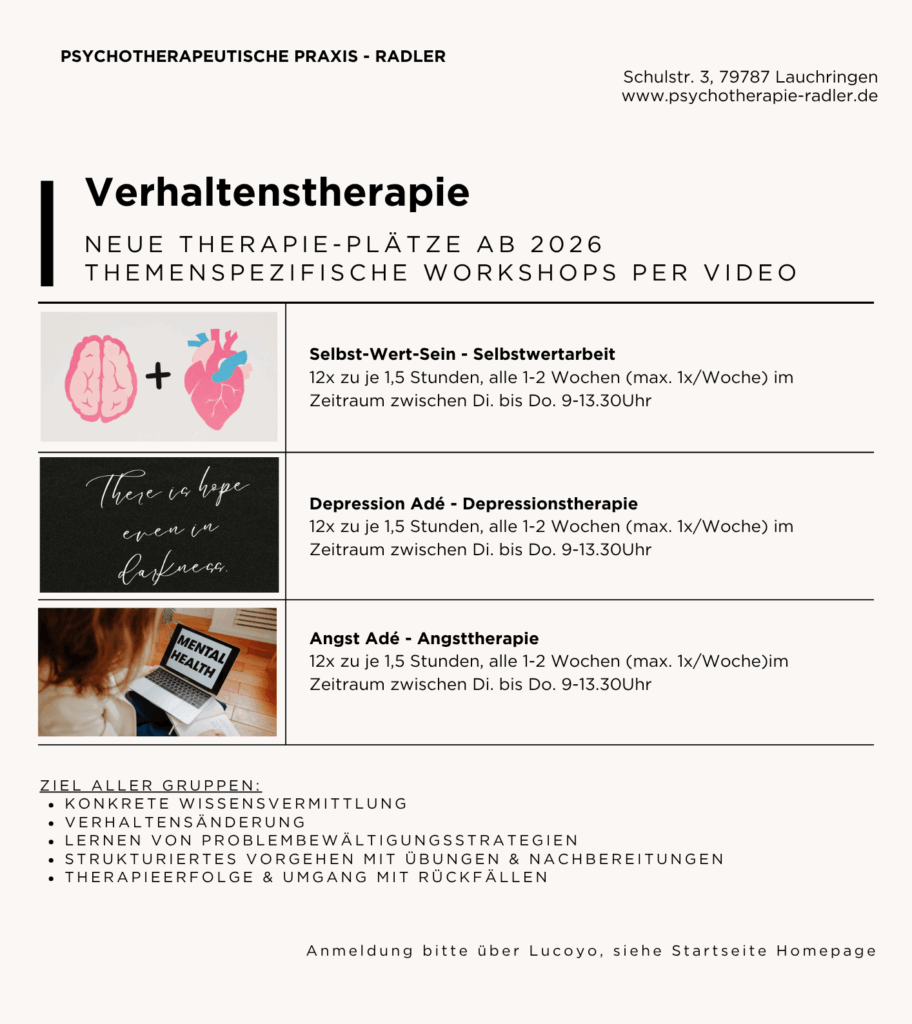 ** Seit Frühjahr 2025 (alle Kassen – Gesetzlich Versicherte, Privatpatienten & Selbstzahler) neue themenspezifische Workshops per Video (Online Gruppentherapie) stehen zur Verfügung. Zweiter Durchlauf geplant ab 2026, Wartelisten geöffnet.